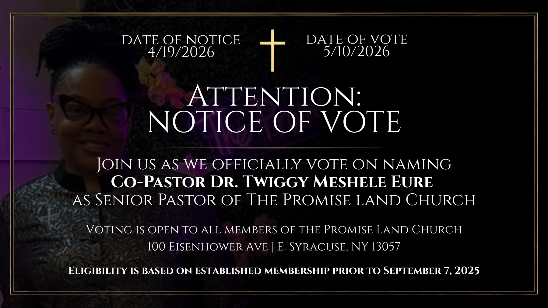 In light of this season, the Elders of The Promise Land Church issue this formal notice of vote. All established Promise Land Church members prior to September 7th, 2025, are respectfully invited to join us May 10, 2026, as we come together to officially vote on the appointment of Co-Pastor Twiggy Meshele Eure as Senior Pastor of The Promise Land Church.